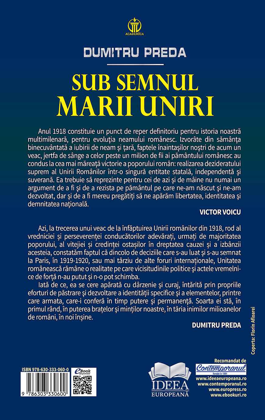 Anul 1918 constituie un punct de reper definitoriu pentru istoria noastră multimilenară, pentru evoluţia neamului românesc. Izvorâte din sămânţa binecuvântată a iubirii de neam şi ţară, faptele înaintaşilor noştri de acum un veac, jertfa de sânge a celor peste un milion de fii ai pământului românesc au condus la cea mai măreaţă victorie a poporului român: realizarea dezideratului suprem al Unirii Românilor într-o singură entitate statală, independentă şi suverană. Ea trebuie să reprezinte pentru cei de azi şi de mâine nu numai un argument de a fi şi de a rezista pe pământul pe care ne-am născut şi ne-am dezvoltat, dar şi de a fi mereu pregătiți să ne apărăm libertatea, identitatea şi demnitatea naţională. / Victor Voicu
