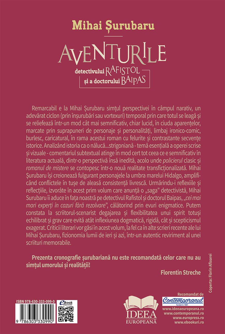 Remarcabil e la Mihai Șurubaru simțul perspectivei în câmpul narativ, un adevărat ciclon (prin înșurubări sau vortexuri) temporal prin care totul se leagă și se reliefează într-un mod cât mai semnificativ, chiar lucid, în ciuda aparențelor, marcate prin suprapuneri de personaje și personalități, limbaj ironico-comic, burlesc, caricatural, în rama acestui roman cu felurite și contrastante secvențe istorice. Analizând istoria ca o nălucă…strigoniană – temă esențială a operei scrise și vizuale – comentariul subtextual atinge în mod cert tot ceea ce e semnificativ în literatura actuală, dintr-o perspectivă însă inedită, acolo unde policierul clasic și romanul de mistere se contopesc într-o nouă realitate transficționalizată. Mihai Șurubaru își creionează fulgurant personajele la umbra marelui Hidalgo, amplificând conflictele în tușe de aleasă consistență livrescă. Urmărindu-i reflexiile și reflecțiile, izvorâte în acest prim volum care anunță o „saga” detectivistă, Mihai Surubaru îi aduce în fața noastră pe detectivul Rafistol și doctorul Baipas, „cei mai mari experți în cazuri fără rezolvare”, călătorind prin evuri enigmatice. Putem constata la scriitorul-scenarist degajarea și flexibilitatea unui spirit totuși echilibrat și grav care evită atât inflexiunea dogmatică, rigidă, cât și scepticismul exagerat. Criticii literari vor găsi în acest volum, la fel ca în alte scrieri recente ale lui Mihai Șurubaru, fizionomia lumii de ieri și azi, într-un autentic reviriment al unei scriituri memorabile.